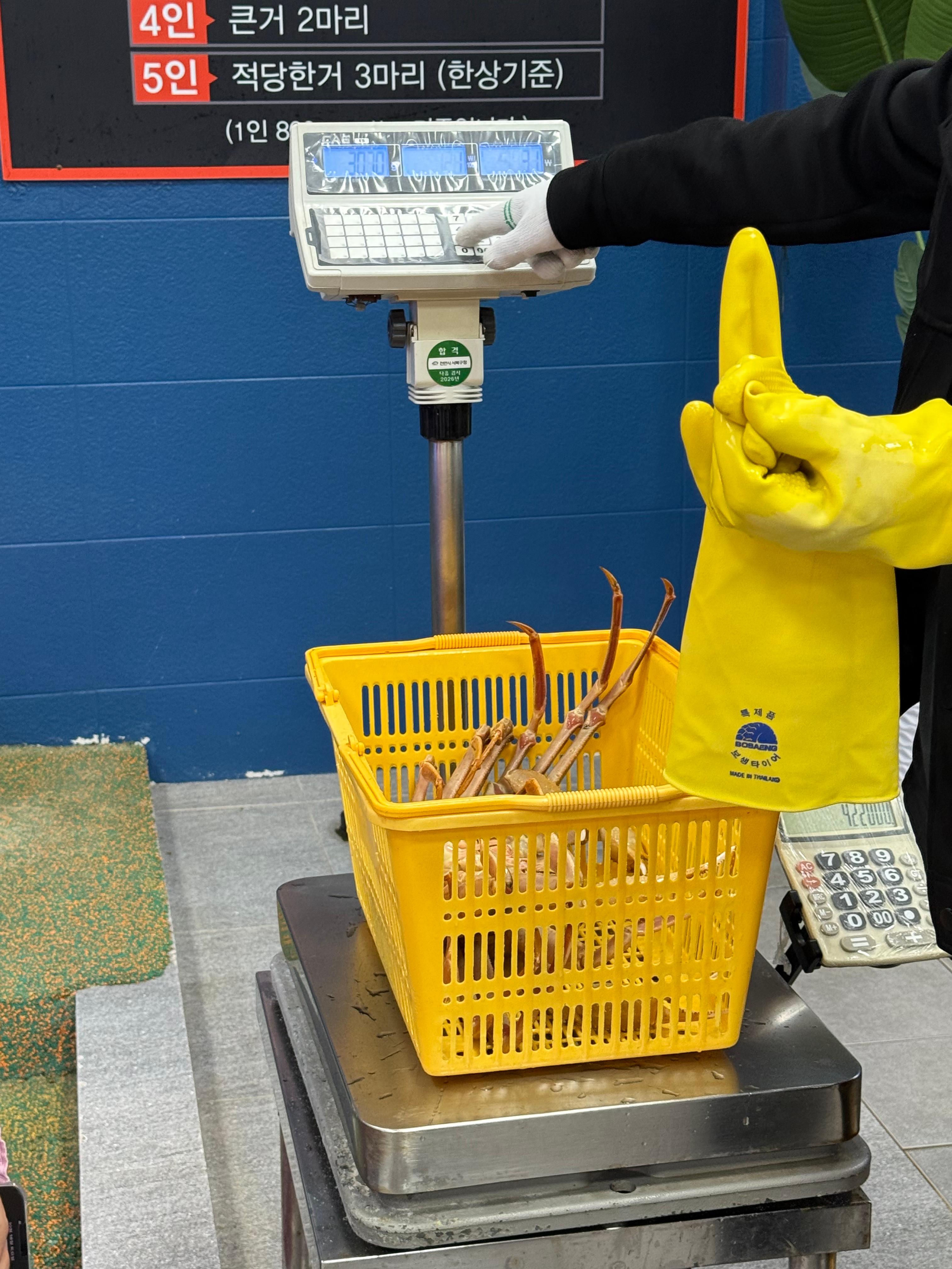 대게는 보통 마리당 2kg 언저리, 킹크랩은 마리당 4kg 언저리 정도고 성인 1인당 1kg에 식사하면 배부르게 먹을 수 있습니다. (게로만 배채우려면 인당 2kg 도 부족할수도… 근데 먹다보면 물려요 🥲😅)